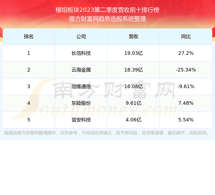 按照趋势选股系统统计,该股所属板块为模组板块,该板块共有5只股票,移远通信2023第二季度营收在该板块中排名为第5名,该板块2023第二季度营收排名前十的股票如下表: