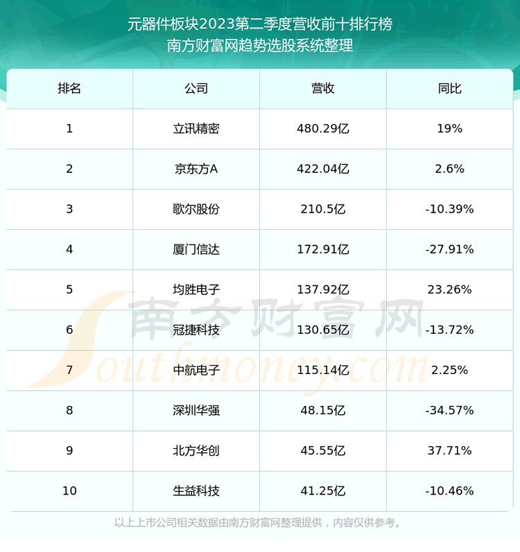 按照趋势选股系统统计,该股所属板块为元器件板块,该板块共有50只股票,禾迈股份2023第二季度营收在该板块中排名为第50名,该板块2023第二季度营收排名前十的股票如下表: