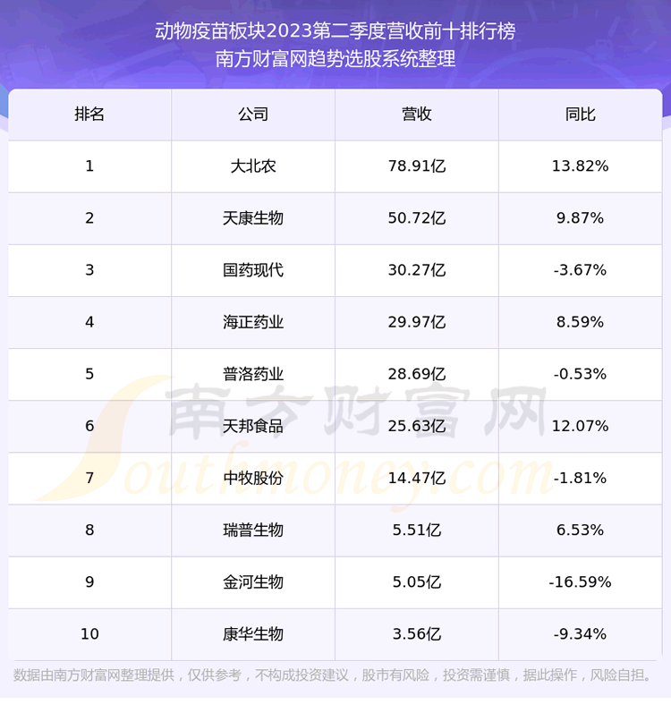 按照趋势选股系统统计,该股所属板块为动物疫苗板块,该板块共有20只股票,海利生物2023第二季度营收在该板块中排名为第18名,该板块2023第二季度营收排名前十的股票如下表: