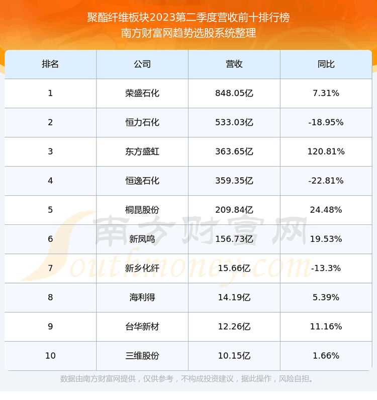 按照趋势选股系统统计,该股所属板块为聚酯纤维板块,该板块共有17只股票,三维股份2023第二季度营收在该板块中排名为第10名,该板块2023第二季度营收排名前十的股票如下表: