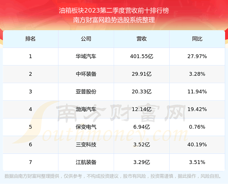 按照趋势选股系统统计,该股所属板块为油箱板块,该板块共有7只股票,亚普股份2023第二季度营收在该板块中排名为第3名,该板块2023第二季度营收排名前十的股票如下表: