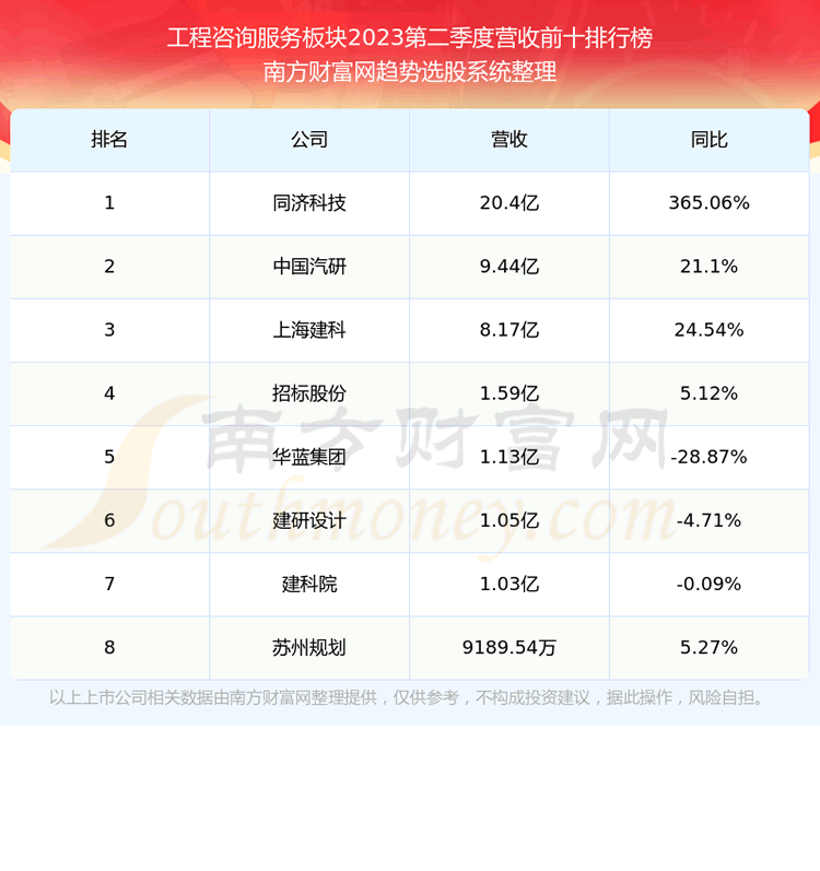 按照趋势选股系统统计,该股所属板块为工程咨询服务板块,该板块共有8只股票,勘设股份2023第二季度营收在该板块中排名为第8名,该板块2023第二季度营收排名前十的股票如下表:
