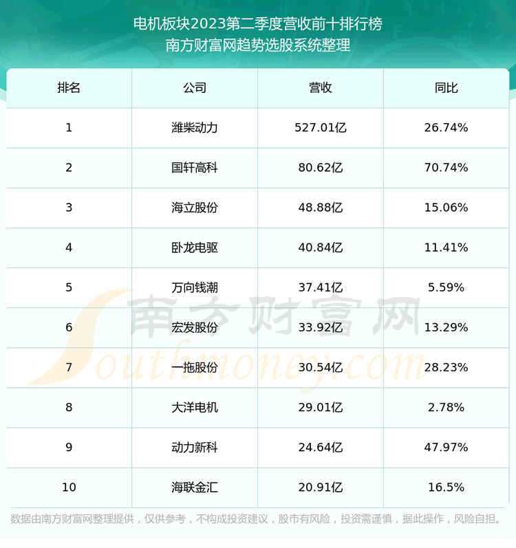按照趋势选股系统统计,该股所属板块为电机板块,该板块共有58只股票,卧龙电驱2023第二季度营收在该板块中排名为第4名,该板块2023第二季度营收排名前十的股票如下表:
