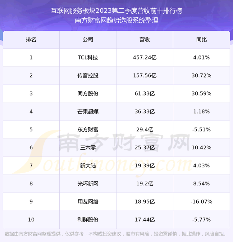 按照趋势选股系统统计,该股所属板块为互联网服务板块,该板块共有50只股票,航天信息2023第二季度营收在该板块中排名为第50名,该板块2023第二季度营收排名前十的股票如下表: