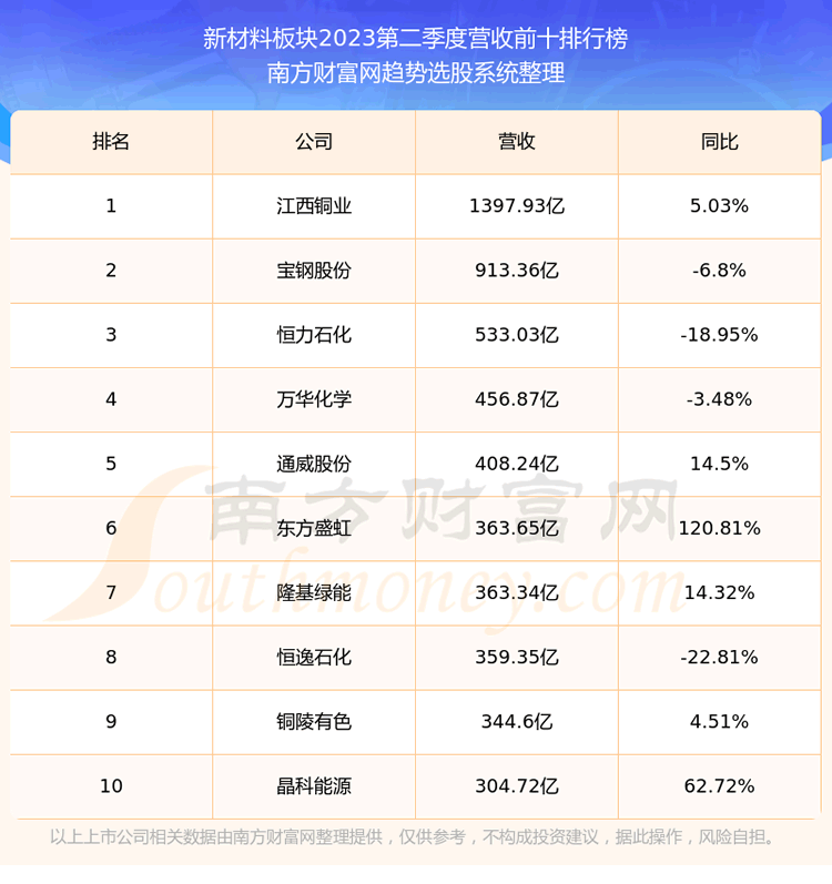 按照趋势选股系统统计,该股所属板块为新材料板块,该板块共有478只股票,万华化学2023第二季度营收在该板块中排名为第4名,该板块2023第二季度营收排名前十的股票如下表: