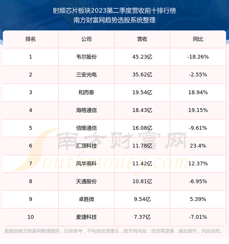 按照趋势选股系统统计,该股所属板块为射频芯片板块,该板块共有24只股票,国博电子2023第二季度营收在该板块中排名为第24名,该板块2023第二季度营收排名前十的股票如下表: