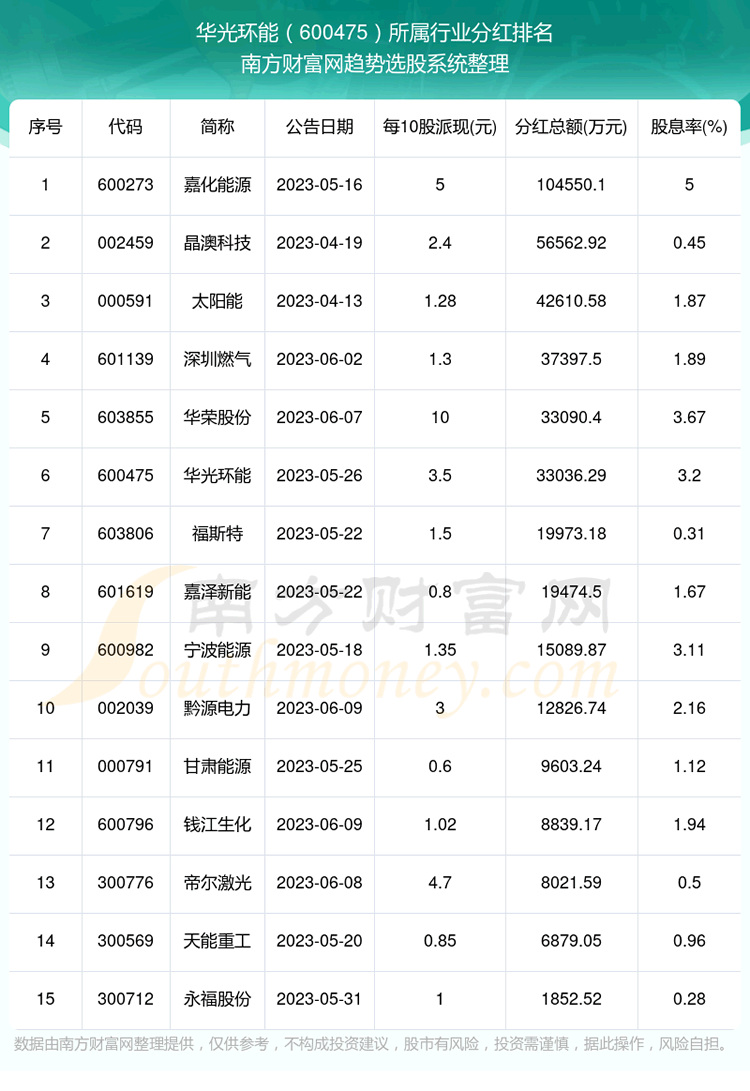 按照趋势选股系统统计,华光环能所属行业为电源设备行业,电源设备行业分红排名情况如下表: