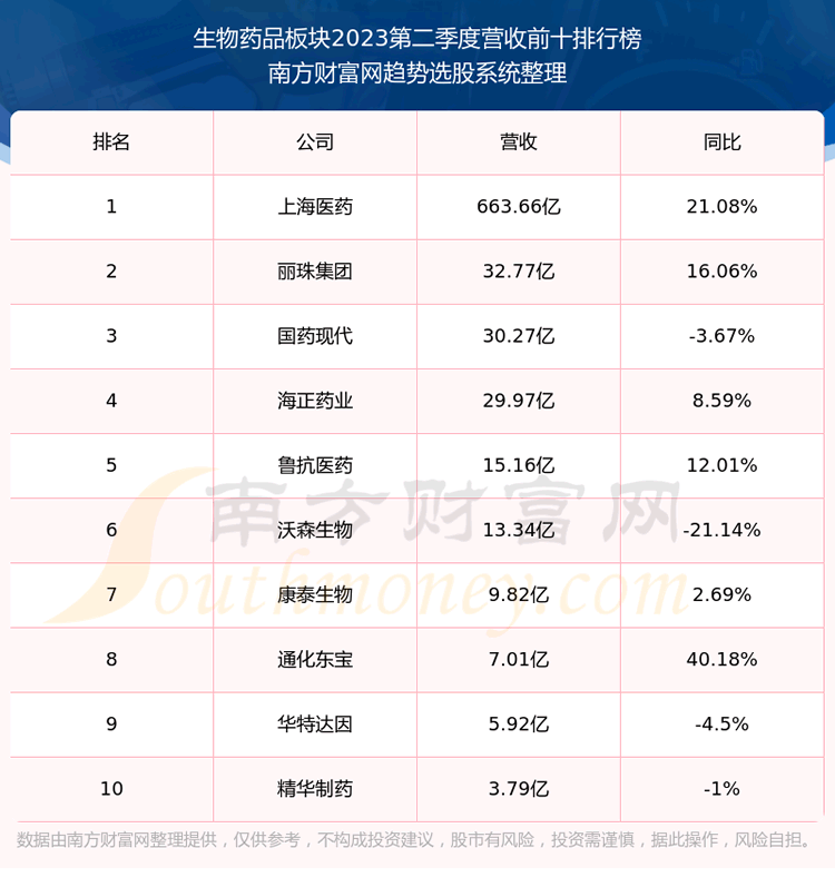 按照趋势选股系统统计,该股所属板块为生物药品板块,该板块共有19只股票,凯因科技2023第二季度营收在该板块中排名为第19名,该板块2023第二季度营收排名前十的股票如下表: