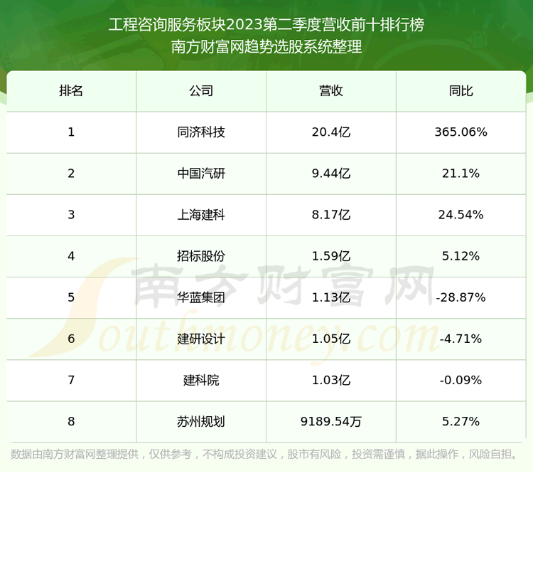 按照趋势选股系统统计,该股所属板块为工程咨询服务板块,该板块共有8只股票,中衡设计2023第二季度营收在该板块中排名为第8名,该板块2023第二季度营收排名前十的股票如下表: