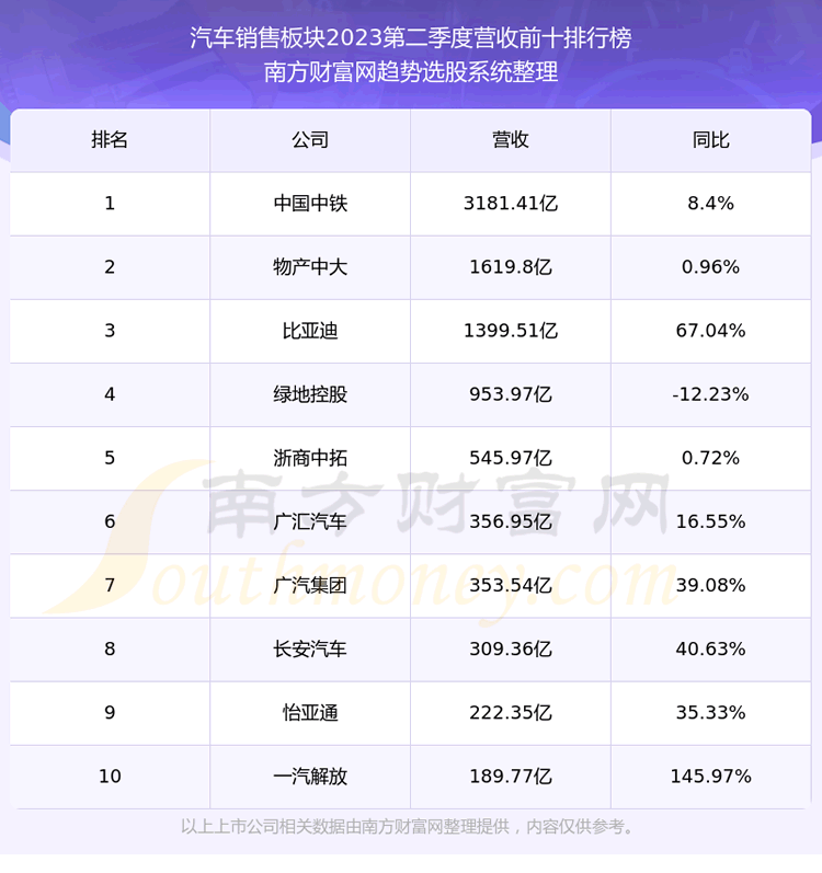 按照趋势选股系统统计,该股所属板块为汽车销售板块,该板块共有58只股票,北汽蓝谷2023第二季度营收在该板块中排名为第58名,该板块2023第二季度营收排名前十的股票如下表: