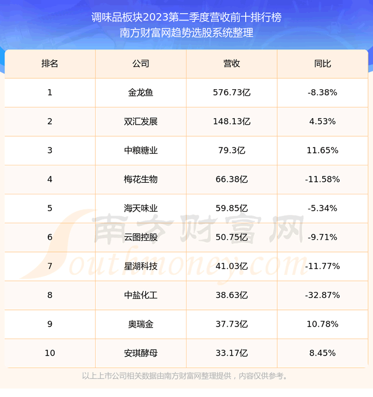 按照趋势选股系统统计,该股所属板块为调味品板块,该板块共有48只股票,海天味业2023第二季度营收在该板块中排名为第5名,该板块2023第二季度营收排名前十的股票如下表: