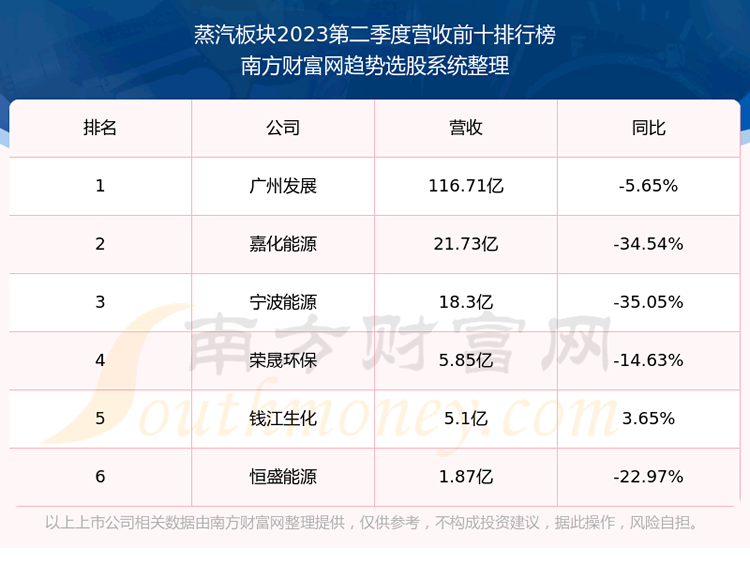 按照趋势选股系统统计,该股所属板块为蒸汽板块,该板块共有6只股票,恒盛能源2023第二季度营收在该板块中排名为第6名,该板块2023第二季度营收排名前十的股票如下表: