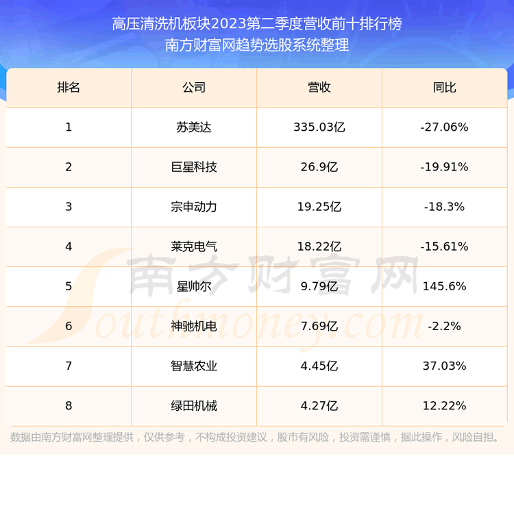 按照趋势选股系统统计,该股所属板块为高压清洗机板块,该板块共有8只股票,绿田机械2023第二季度营收在该板块中排名为第8名,该板块2023第二季度营收排名前十的股票如下表: