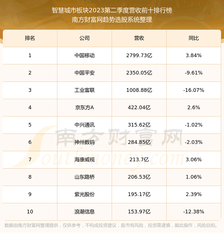 按照趋势选股系统统计,该股所属板块为智慧城市板块,该板块共有273只股票,中贝通信2023第二季度营收在该板块中排名为第273名,该板块2023第二季度营收排名前十的股票如下表: