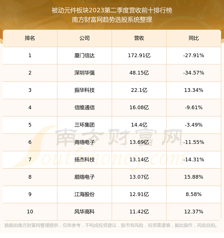 按照趋势选股系统统计,该股所属板块为被动元件板块,该板块共有24只股票,鸿远电子2023第二季度营收在该板块中排名为第15名,该板块2023第二季度营收排名前十的股票如下表: