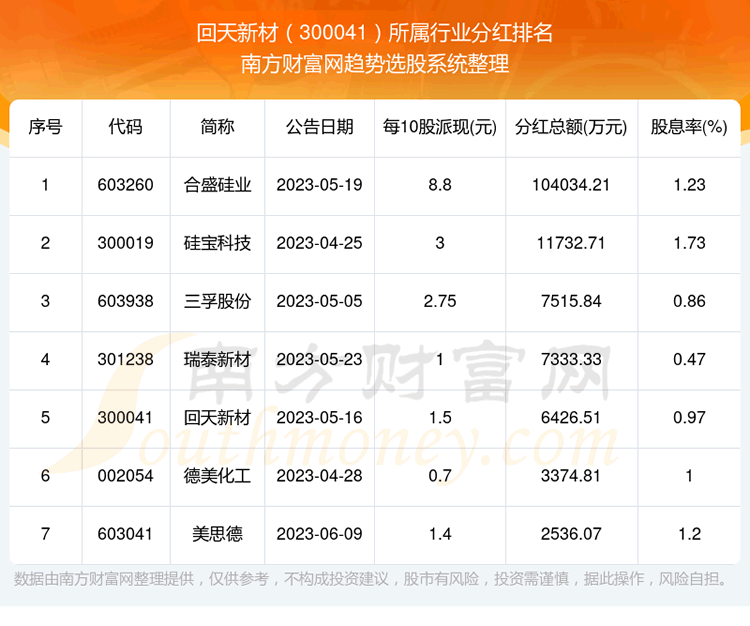 按照趋势选股系统统计,回天新材所属行业为化学制品行业,化学制品行业分红排名情况如下表: