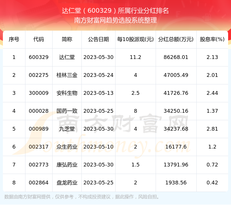 按照趋势选股系统统计,达仁堂所属行业为中成药行业,中成药行业分红排名情况如下表: