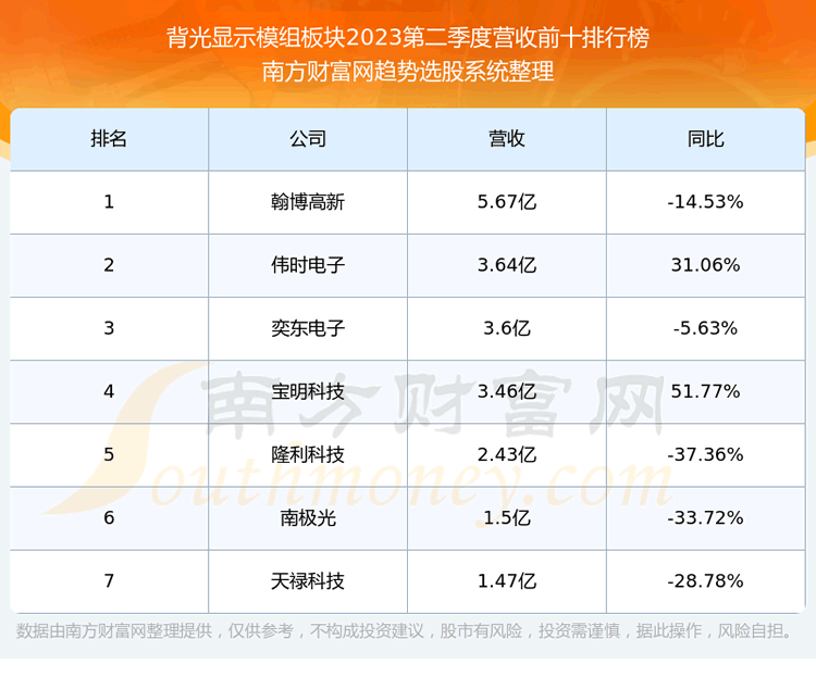按照趋势选股系统统计,该股所属板块为背光显示模组板块,该板块共有7只股票,伟时电子2023第二季度营收在该板块中排名为第2名,该板块2023第二季度营收排名前十的股票如下表: