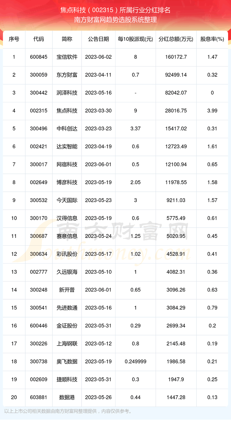 按照趋势选股系统统计,焦点科技所属行业为互联网服务行业,互联网服务行业分红排名情况如下表:
