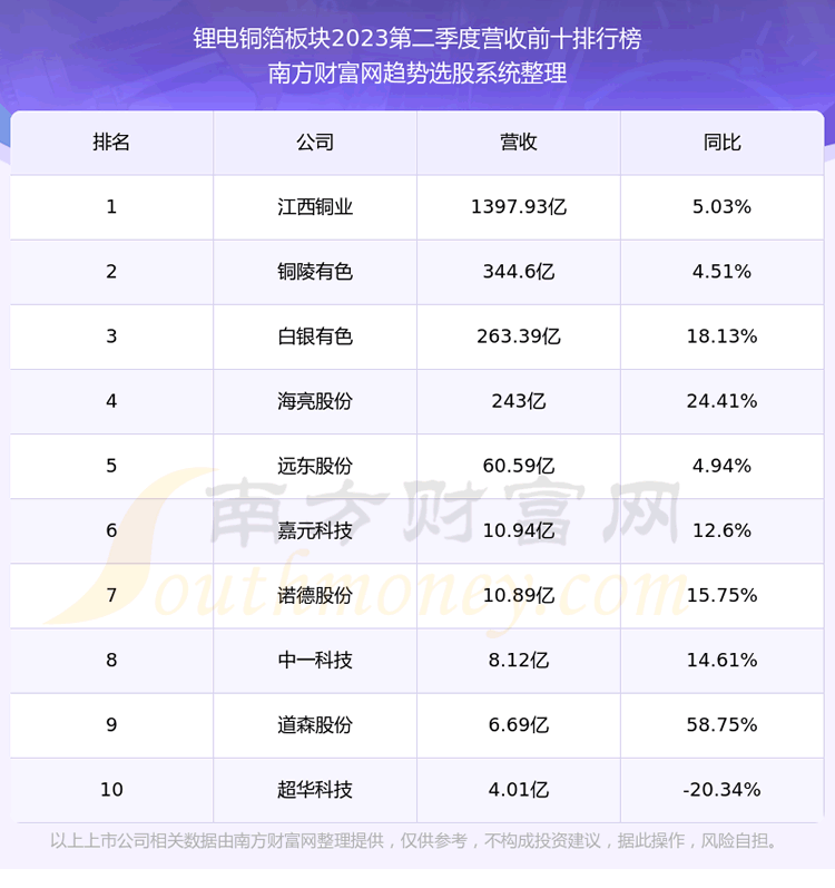 按照趋势选股系统统计,该股所属板块为锂电铜箔板块,该板块共有13只股票,嘉元科技2023第二季度营收在该板块中排名为第6名,该板块2023第二季度营收排名前十的股票如下表:
