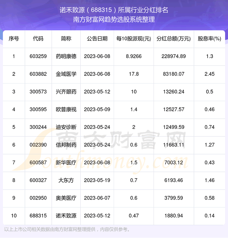 按照趋势选股系统统计,诺禾致源所属行业为医学研究行业,医学研究行业分红排名情况如下表: