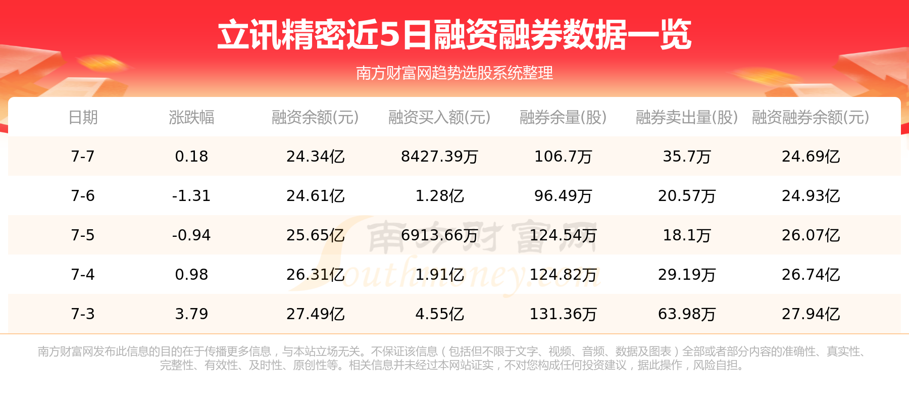 7月7日立讯精密融券信息显示,融资方面,当日融资买入8427.39万元,融资偿还1.12亿元,融资净买额-2727.85万元。融券方面,融券卖出35.7万股,融券偿还25.49万股,融券余量106.7万股,融券余额3554.24万元。融资融券余额24.69亿元。近5日融资融券数据一览见下表: