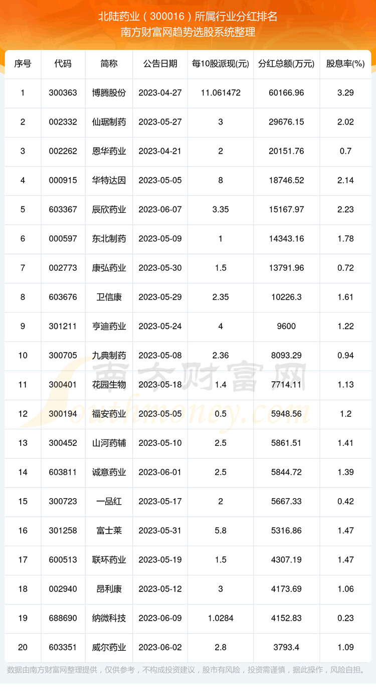 按照趋势选股系统统计,北陆药业所属行业为对比剂行业,对比剂行业分红排名情况如下表:
