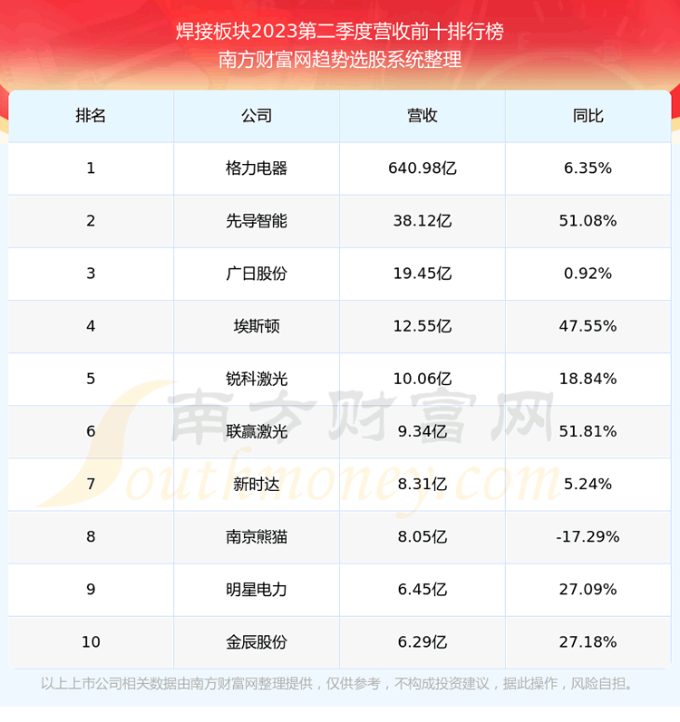 按照趋势选股系统统计,该股所属板块为焊接板块,该板块共有21只股票,联赢激光2023第二季度营收在该板块中排名为第6名,该板块2023第二季度营收排名前十的股票如下表: