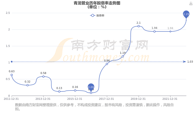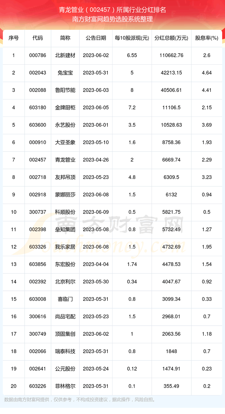 按照趋势选股系统统计,青龙管业所属行业为混凝土管行业,混凝土管行业分红排名情况如下表: