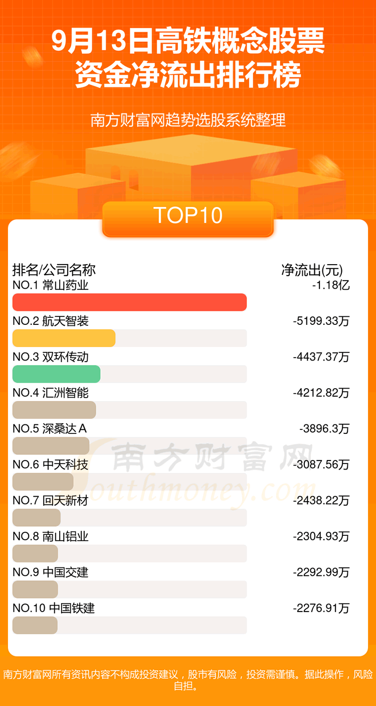 高铁概念股票9月13日资金净流出情况来看,常山药业位列第一位,主力净流出达到-1.18亿元;航天智装排名第二,主力净流出为-5199.33万元;双环传动排名第三,主力净流出-4437.37万元。主力净流出排名前10的还有:汇洲智能、深桑达A、中天科技、回天新材、南山铝业、中国交建、中国铁建。