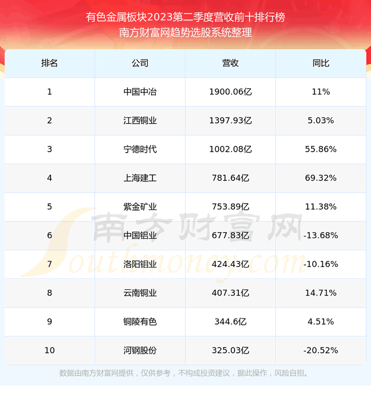 按照趋势选股系统统计,该股所属板块为有色金属板块,该板块共有230只股票,中孚实业2023第二季度营收在该板块中排名为第58名,该板块2023第二季度营收排名前十的股票如下表: