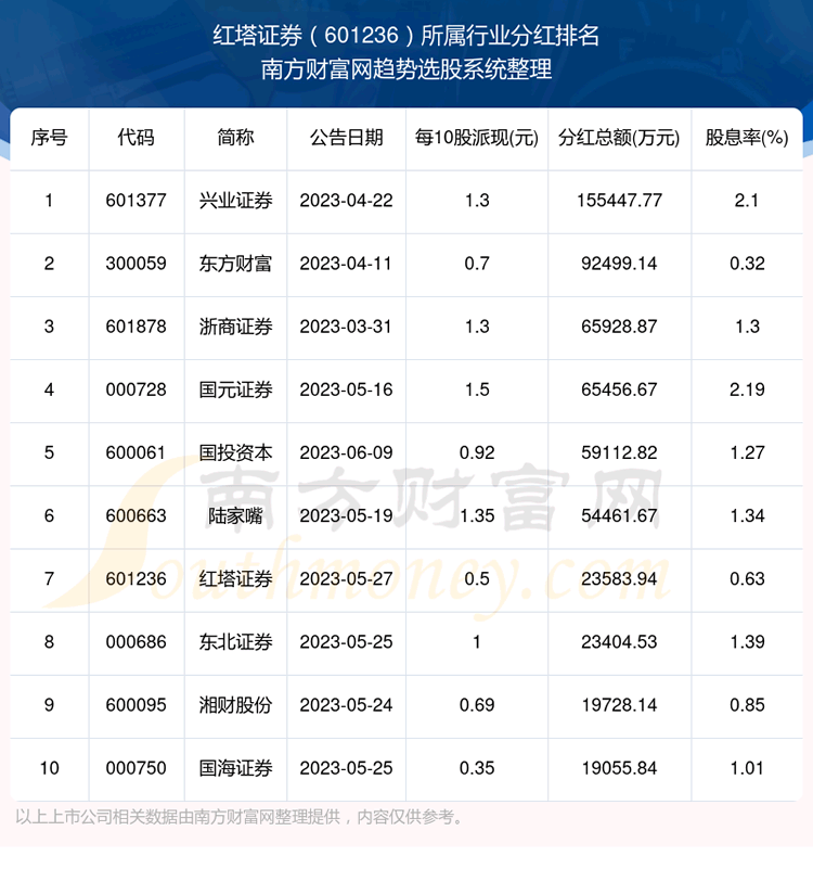 按照趋势选股系统统计,红塔证券所属行业为期货行业,期货行业分红排名情况如下表: