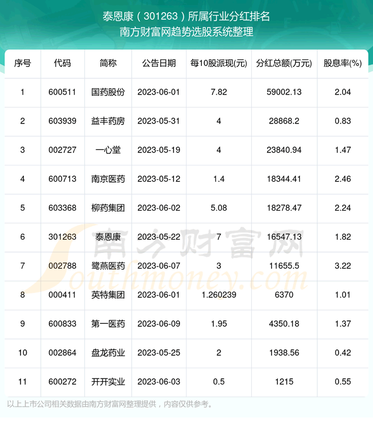 按照趋势选股系统统计,泰恩康所属行业为医药商业行业,医药商业行业分红排名情况如下表: