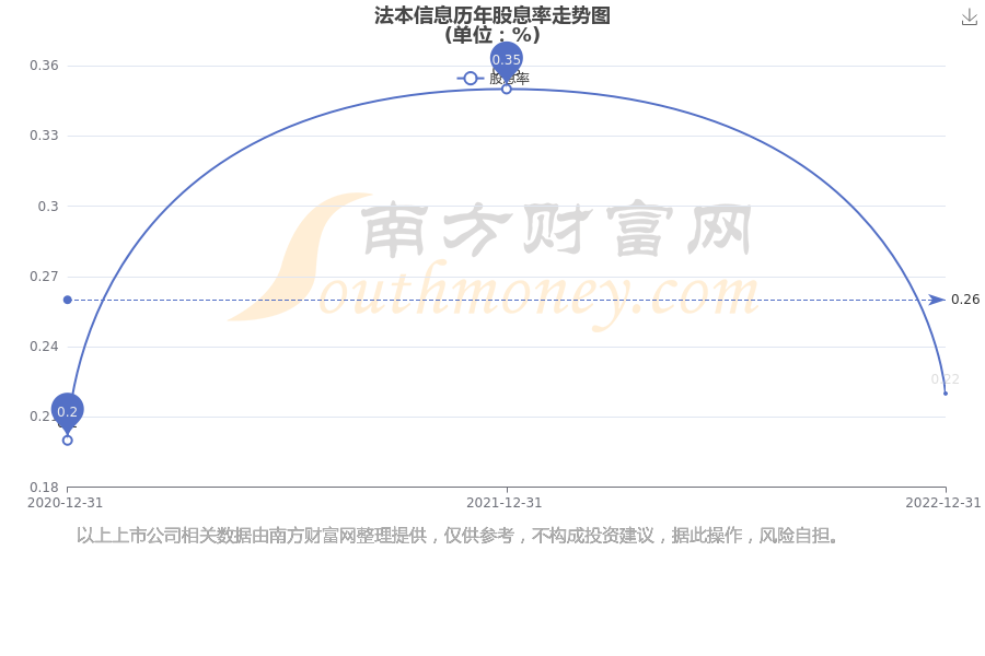 法本信息最新一次公布的分红方案为10派0.35元。本次权益分派股权登记日为2023年6月5日,除权除息日为2023年6月6日,派息日为2023年6月6日。