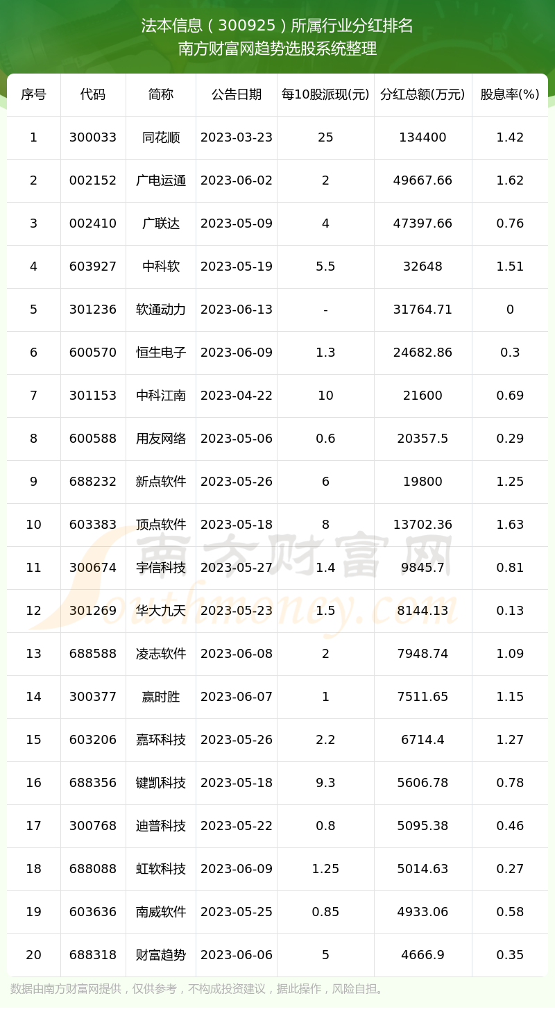 按照趋势选股系统统计,法本信息所属行业为软件开发行业,软件开发行业分红排名情况如下表: