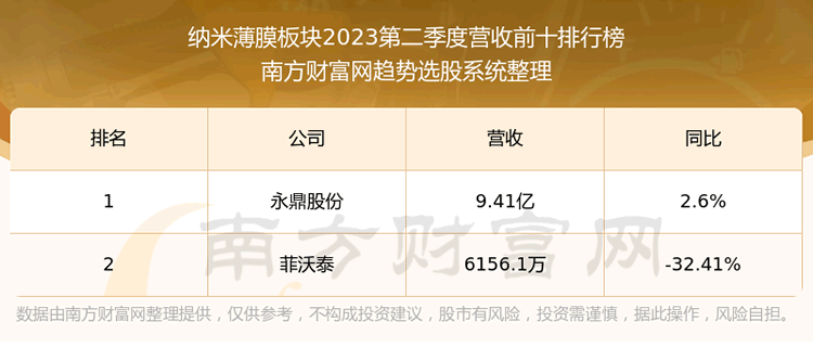 按照趋势选股系统统计,该股所属板块为纳米薄膜板块,该板块共有2只股票,菲沃泰2023第二季度营收在该板块中排名为第2名,该板块2023第二季度营收排名前十的股票如下表: