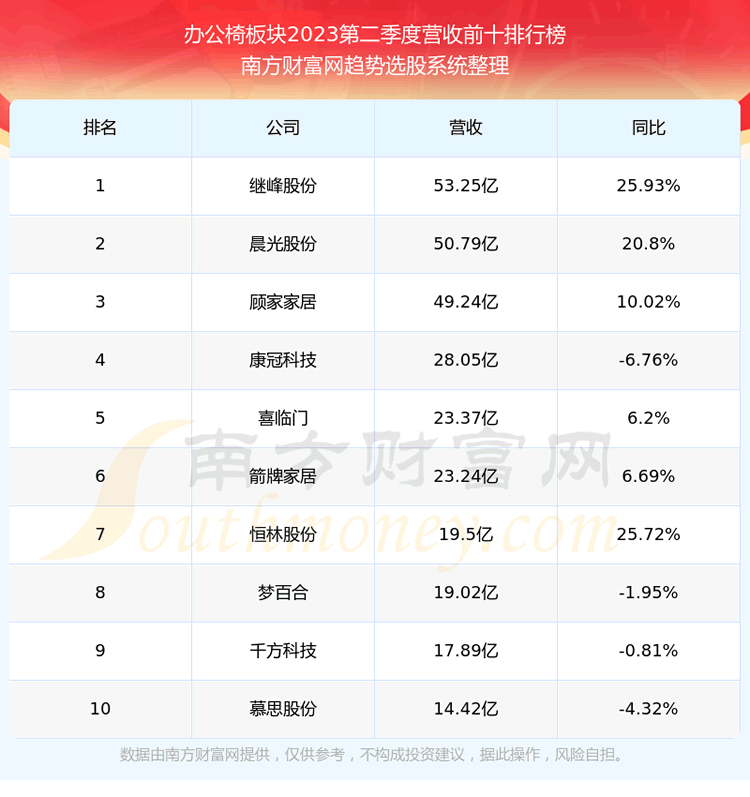 按照趋势选股系统统计,该股所属板块为办公椅板块,该板块共有16只股票,恒林股份2023第二季度营收在该板块中排名为第7名,该板块2023第二季度营收排名前十的股票如下表: