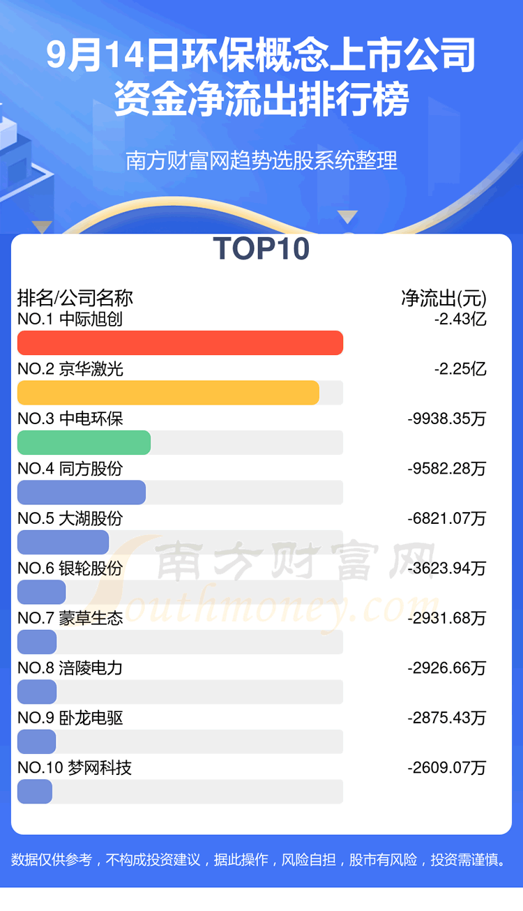 环保概念上市公司9月14日资金净流出情况来看,中际旭创位列第一位,主力净流出达到-2.43亿元;京华激光排名第二,主力净流出为-2.25亿元;中电环保排名第三,主力净流出-9938.35万元。主力净流出排名前10的还有:同方股份、大湖股份、银轮股份、蒙草生态、涪陵电力、卧龙电驱、梦网科技。