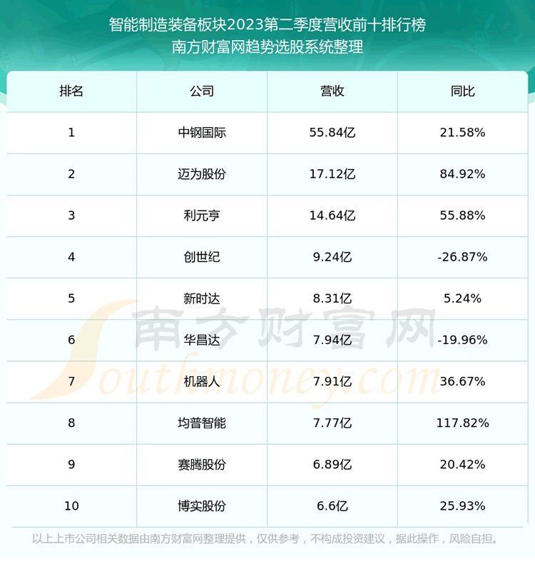 按照趋势选股系统统计,该股所属板块为智能制造装备板块,该板块共有32只股票,瀚川智能2023第二季度营收在该板块中排名为第13名,该板块2023第二季度营收排名前十的股票如下表: