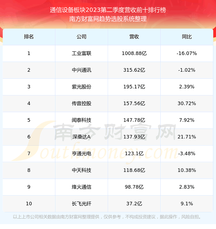 按照趋势选股系统统计,该股所属板块为通信设备板块,该板块共有119只股票,震有科技2023第二季度营收在该板块中排名为第88名,该板块2023第二季度营收排名前十的股票如下表:
