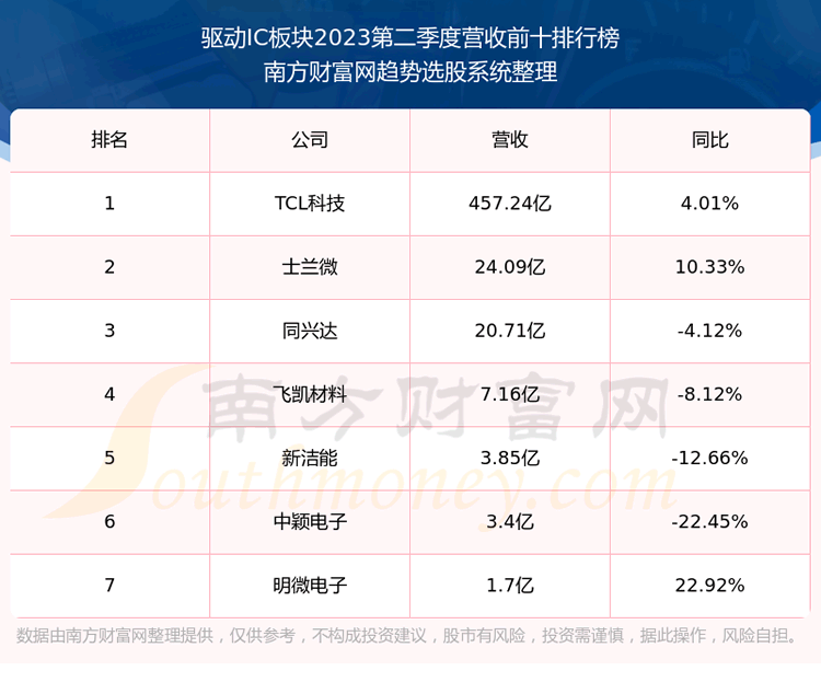 按照趋势选股系统统计,该股所属板块为驱动IC板块,该板块共有7只股票,必易微2023第二季度营收在该板块中排名为第7名,该板块2023第二季度营收排名前十的股票如下表: