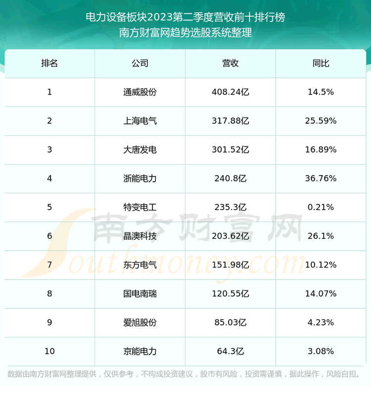 按照趋势选股系统统计,该股所属板块为电力设备板块,该板块共有91只股票,煜邦电力2023第二季度营收在该板块中排名为第91名,该板块2023第二季度营收排名前十的股票如下表: