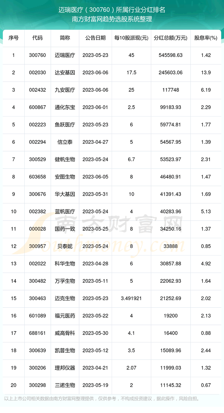 按照趋势选股系统统计,迈瑞医疗所属行业为医疗器械行业,医疗器械行业分红排名情况如下表: