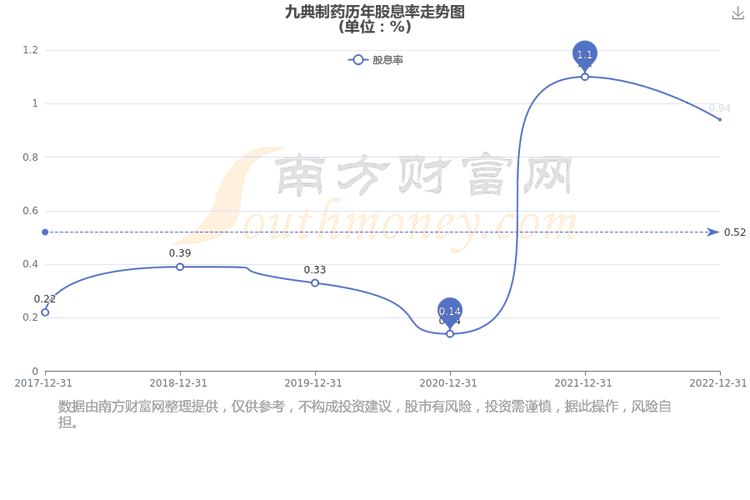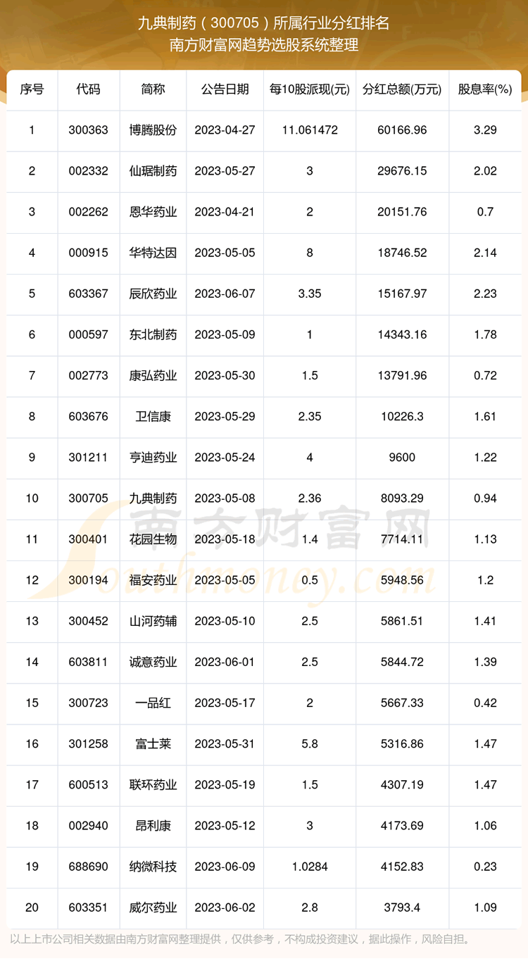 按照趋势选股系统统计,九典制药所属行业为药品制剂行业,药品制剂行业分红排名情况如下表:
