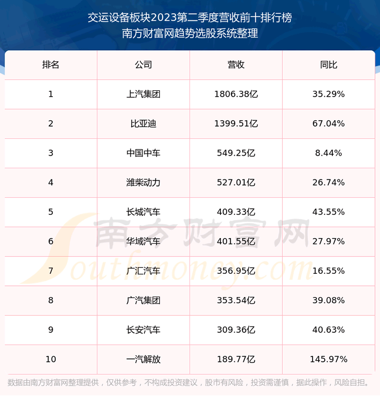 按照趋势选股系统统计,该股所属板块为交运设备板块,该板块共有282只股票,今创集团2023第二季度营收在该板块中排名为第105名,该板块2023第二季度营收排名前十的股票如下表: