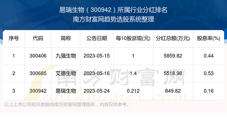 按照趋势选股系统统计,易瑞生物所属行业为检测试剂行业,检测试剂行业分红排名情况如下表:
