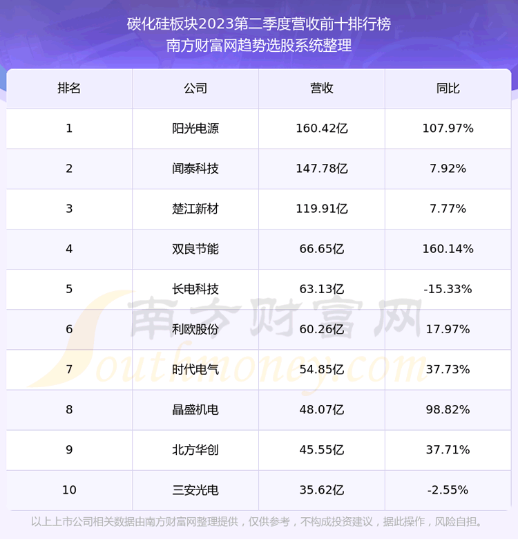 按照趋势选股系统统计,该股所属板块为碳化硅板块,该板块共有41只股票,立霸股份2023第二季度营收在该板块中排名为第41名,该板块2023第二季度营收排名前十的股票如下表: