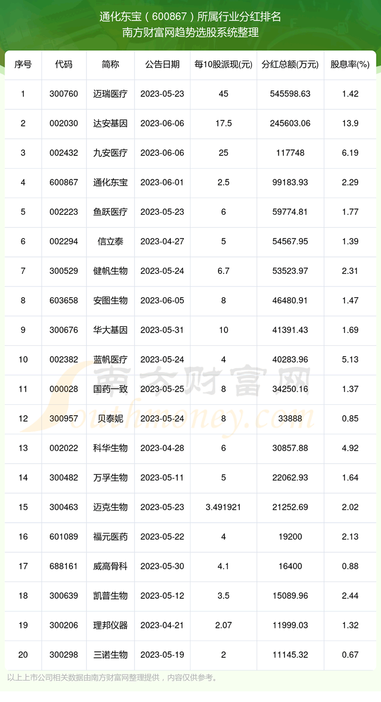 按照趋势选股系统统计,通化东宝所属行业为原料药行业,原料药行业分红排名情况如下表: