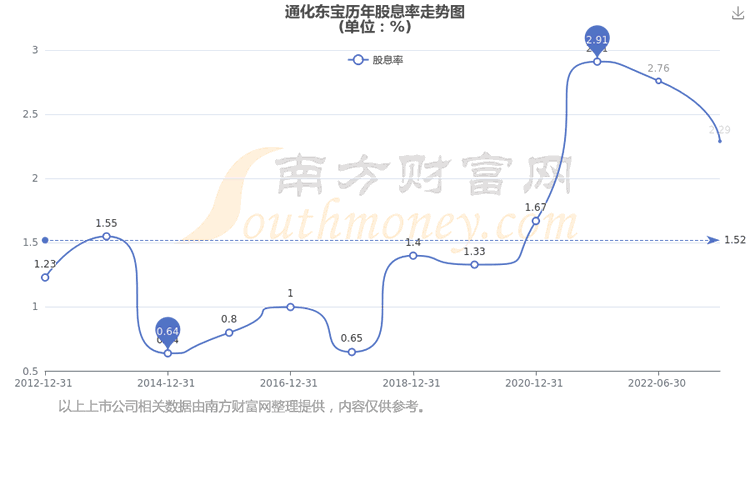 通化东宝最新一次公布的分红方案为10派2.5元。本次权益分派股权登记日为2023年6月8日,除权除息日为2023年6月9日,派息日为2023年6月9日。