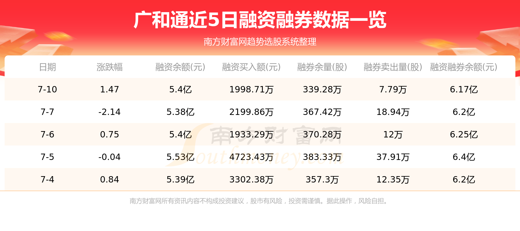7月10日广和通融券信息显示,融资方面,当日融资买入1998.71万元,融资偿还1763.71万元,融资净买额235万元。融券方面,融券卖出7.79万股,融券偿还35.93万股,融券余量339.28万股,融券余额7704.95万元。融资融券余额6.17亿元。近5日融资融券数据一览见下表: